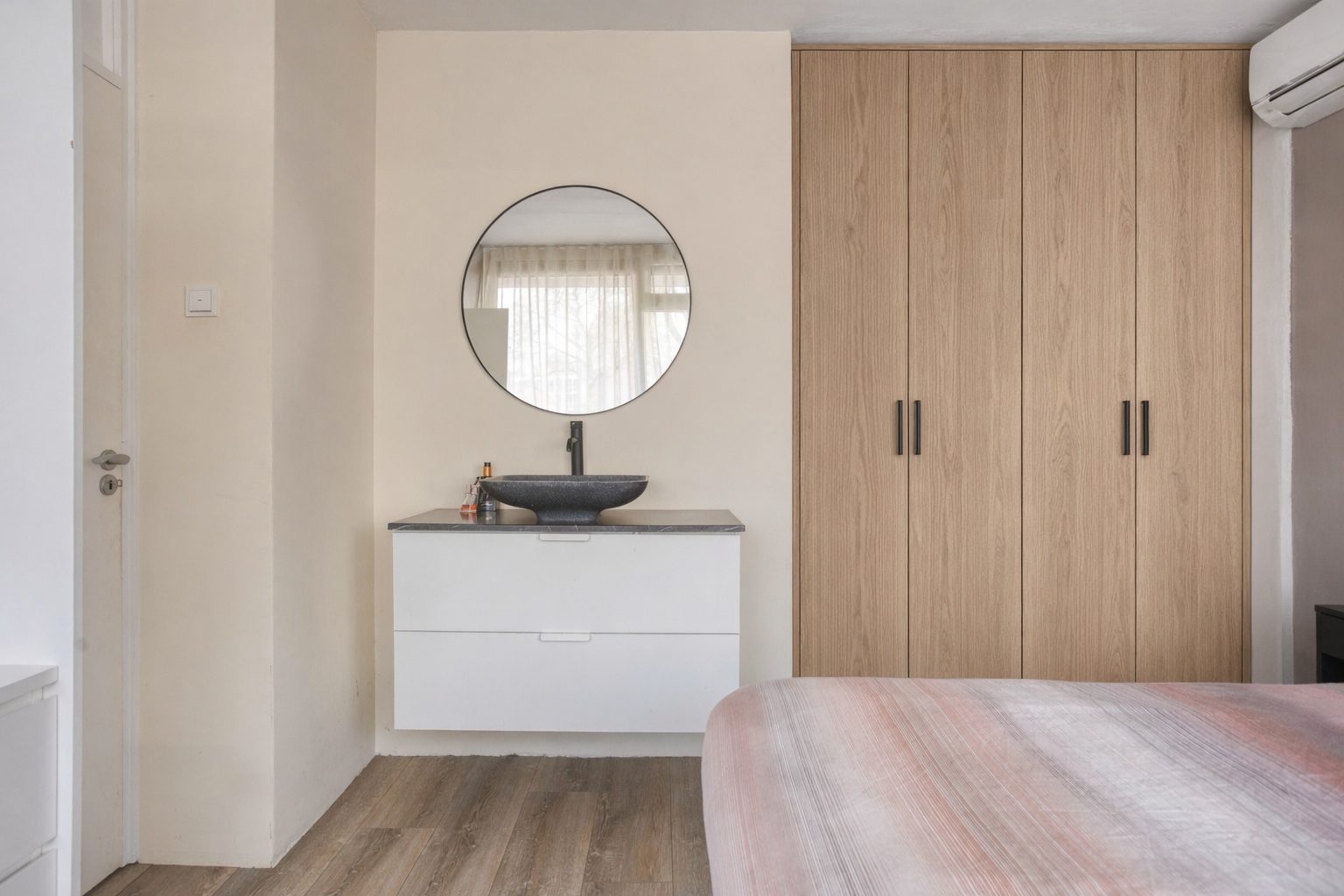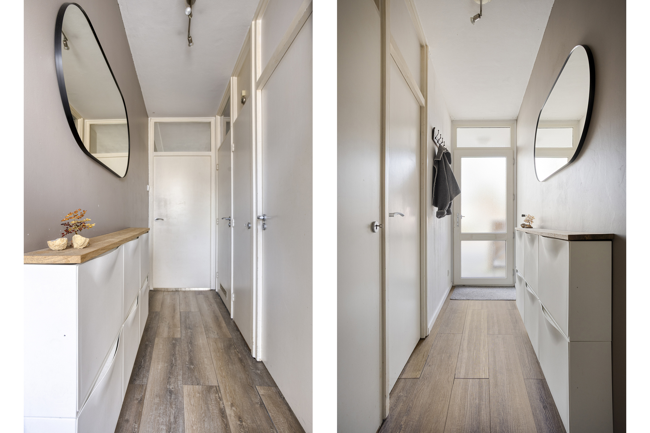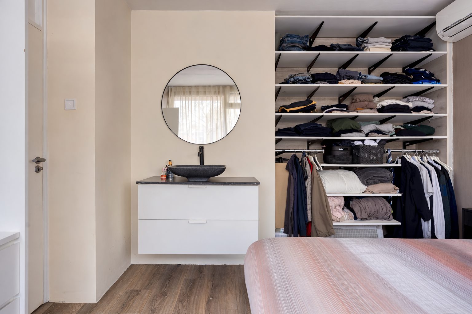 De hal/entree geeft toegang tot de slaapkamer, badkamer en woonkamer. Tevens bevindt zich de meterkast in de hal, welke in 2023 geheel vernieuwd is. De slaapkamer (12 m²) is gelegen aan de voorzijde van het appartement en geniet van veel daglicht. Deze kamer beschikt over een grote open kastenwand, die eventueel af te sluiten is met aan te brengen schuif- of kastdeuren. Daarnaast is er een fraai wastafelmeubel aanwezig met grote lade voor opbergruimte en een moderne ronde spiegel erboven. Daarnaast is er op de slaapkamer plek voor een extra (lade)kast of een (thuis)werkplek naast het raam. De naastgelegen badkamer is volledig betegeld en voorzien van een toilet, fonteintje en ruime inloopdouche.