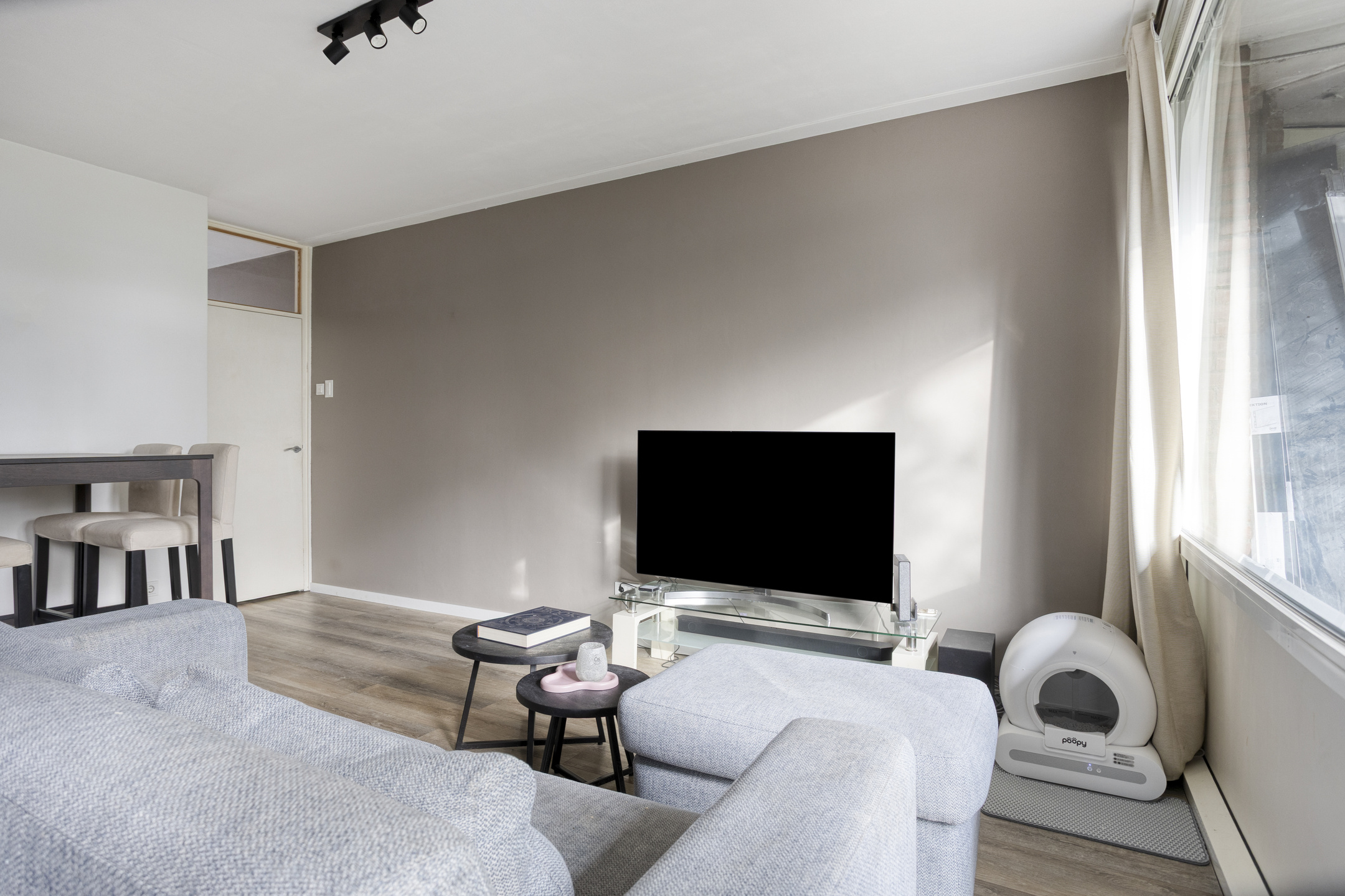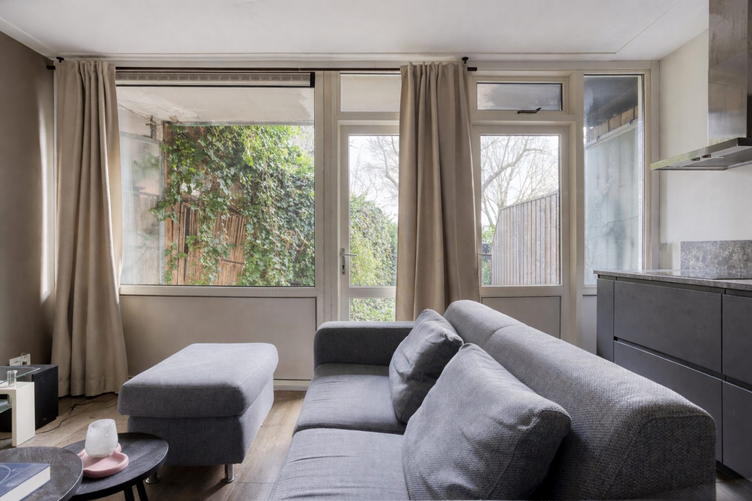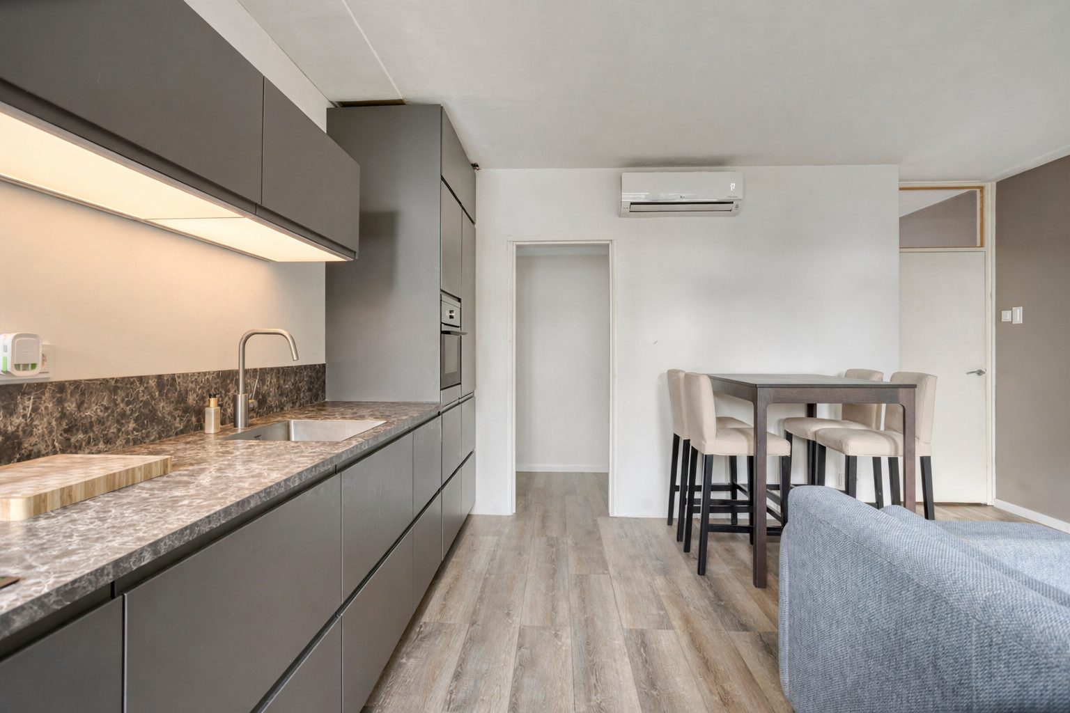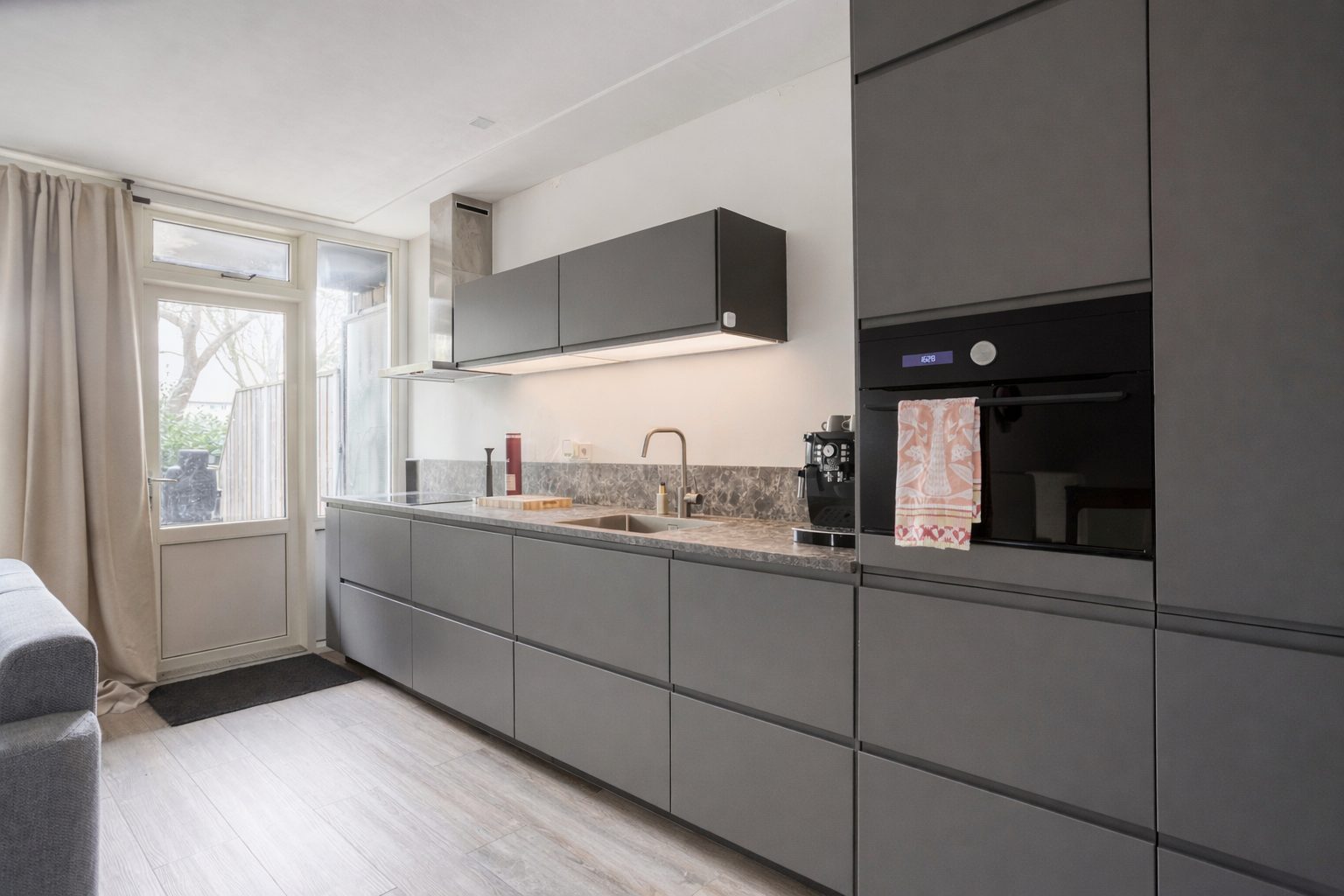 De woonkamer is gelegen aan de achterzijde van het appartement. Deze staat in open verbinding met de moderne, vernieuwde keuken (2023) en geeft toegang tot de achtertuin en open bijkeuken. De woonkamer biedt ruimte voor een eettafel voor vier personen en een gezellige zithoek. De moderne keuken heeft een rechte opstelling met hoge kastenwand en is voorzien van een stijlvol, antraciet keukeninterieur met fraai gemarmerd keukenblad. De keuken is van alle gemakken voorzien en uitgerust met een inductie kookplaat, koel-vriescombinatie, combi-oven, vaatwasser, spoelbak en beschikt over volop bergruimte. In de compacte open bijkeuken bevinden zich, naast de elektrische installatie, de aansluitingen voor de wasapparatuur. Deze ruimte is eventueel af te schermen met een nog aan te brengen deur. Het volledige appartement is voorzien van een keurige laminaatvloer en stucwerk op de wanden en het plafond. Het appartement is geheel gasloos en wordt verwarmd en gekoeld middels een multi-split airco’s, welke zich in de woon- en slaapkamer bevinden.