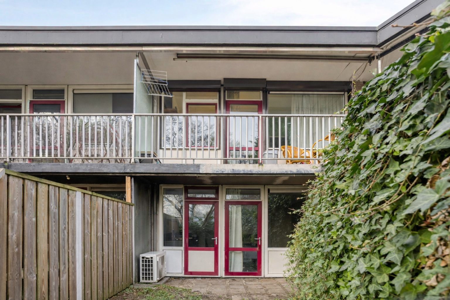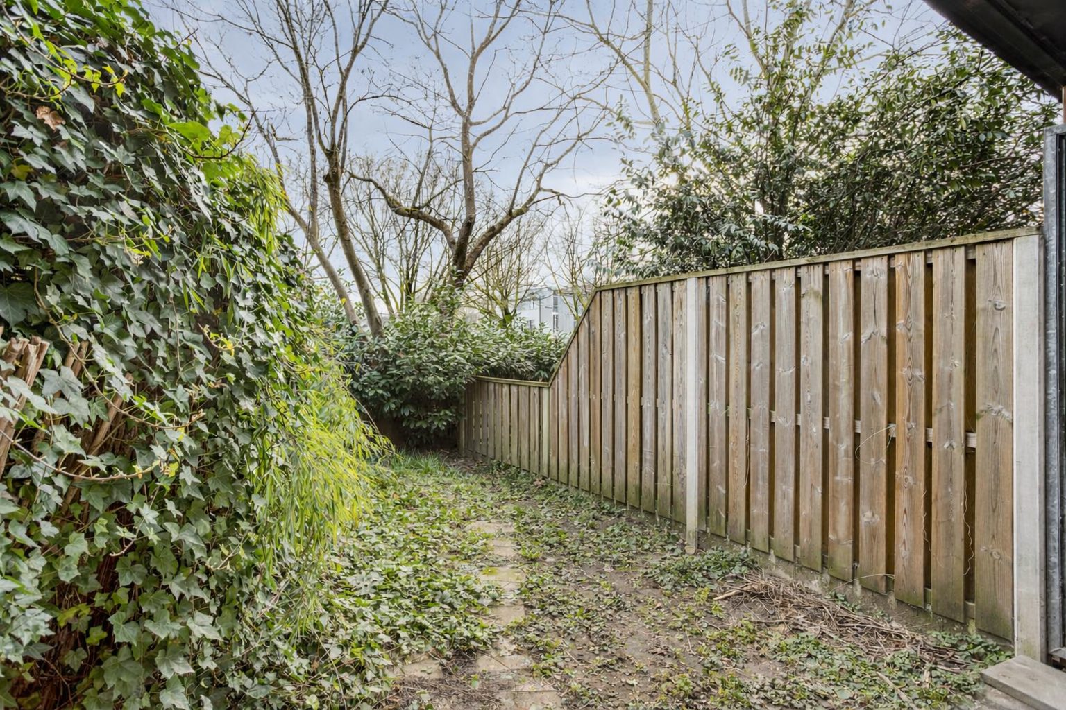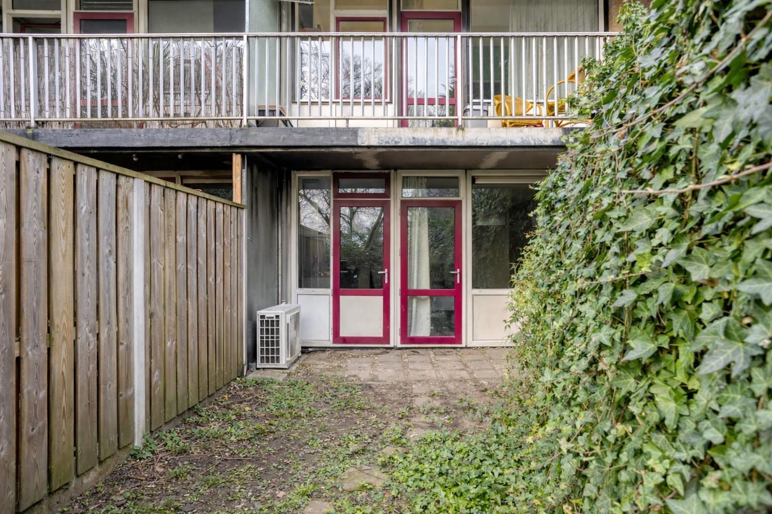 De tuin is gelegen op het zonnige zuiden en voor een klein gedeelte overkapt door het bovenliggende balkon.