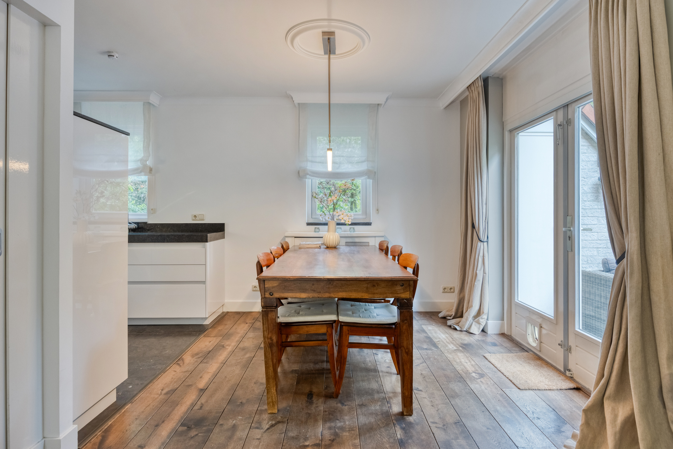 De L-vormige woonkamer met moderne gashaard en eikenhouten vloer is het toonbeeld van sfeer. Geniet van de lichtinval, de prettige indeling en het uitzicht naar de tuin. Openslaande deuren bij het eetgedeelte geven toegang tot het terras en aan de aan de andere zijde, bij het zitgedeelte, is een tweede toegang tot de tuin.